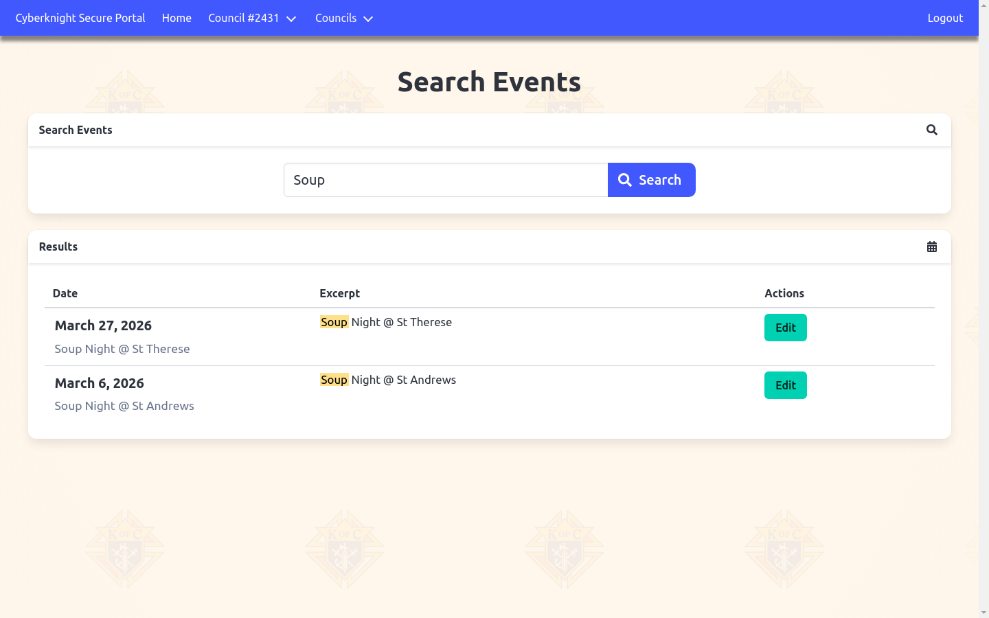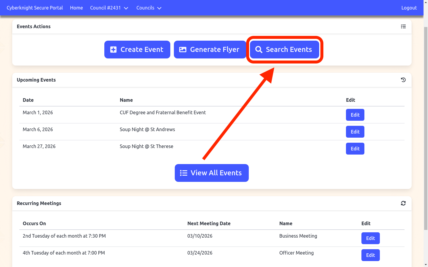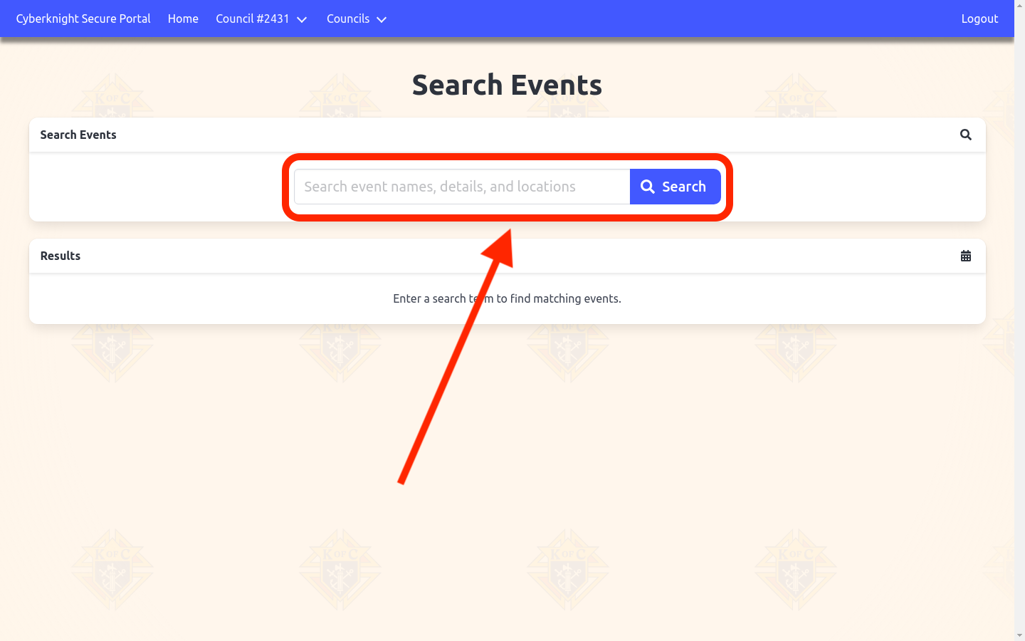 Search across all of your council’s events by name, details, or location — including events that aren’t shown in the upcoming events list.