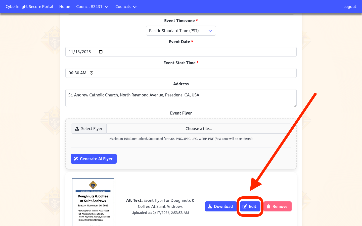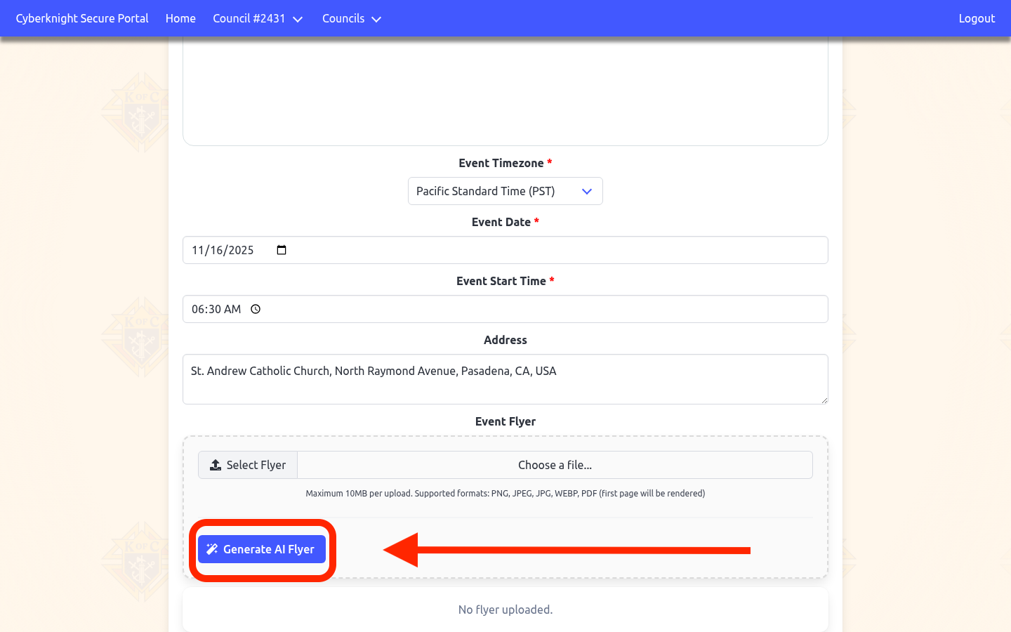 Navigate to the event you want to create a flyer for, then click the blue “Generate AI Flyer” button in the Event Flyer section.