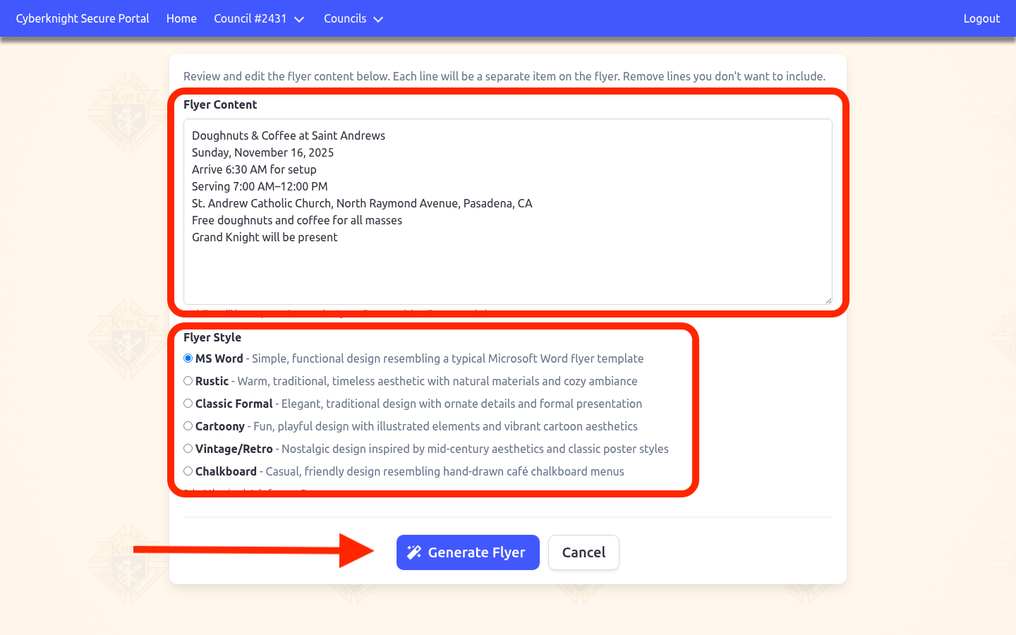 Follow the same process as event-attached flyers: edit content, select a style, generate, and review. The main difference is that when you’re ready to use the flyer, it will download directly to your device instead of being attached to an event.