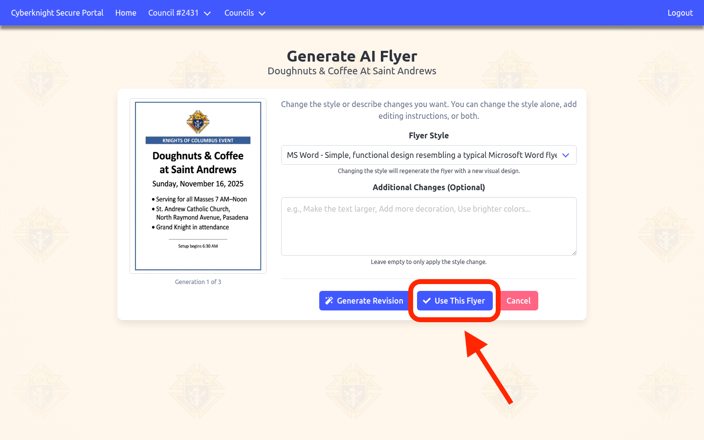 Once generated, you can review the flyer preview and either use it immediately or generate up to 3 revisions by changing the style or adding editing instructions. Once you’re satisfied with the flyer, click “Use This Flyer” to attach it to your event. It will then automatically update on your council website and newsletter.