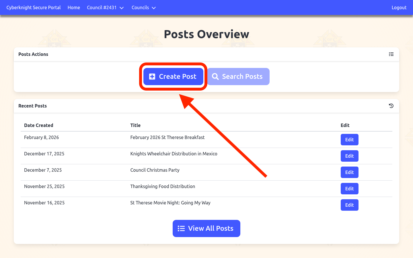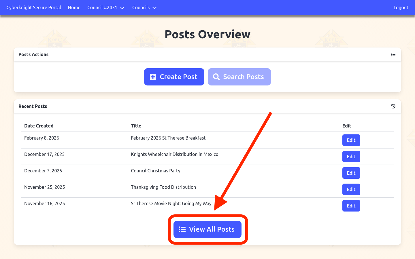 The full post list displays all council posts in a searchable, sortable table. By default it is sorted by most recent first.