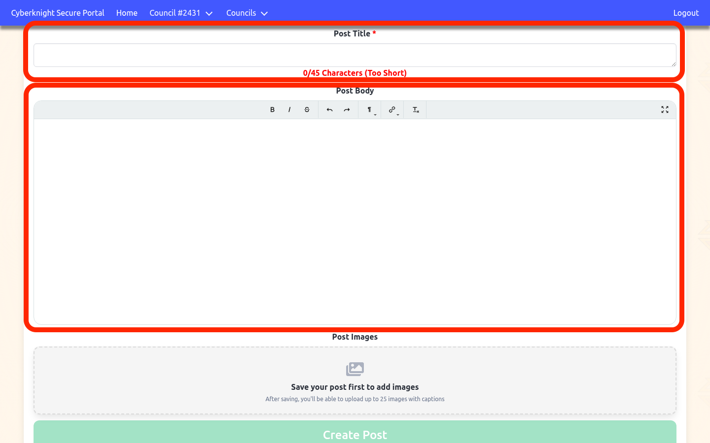 Enter a Post Title (up to 45 characters — a live counter tracks your progress) and write your content in the Post Body editor. The editor supports rich text formatting such as bold, italics, links, and lists.
