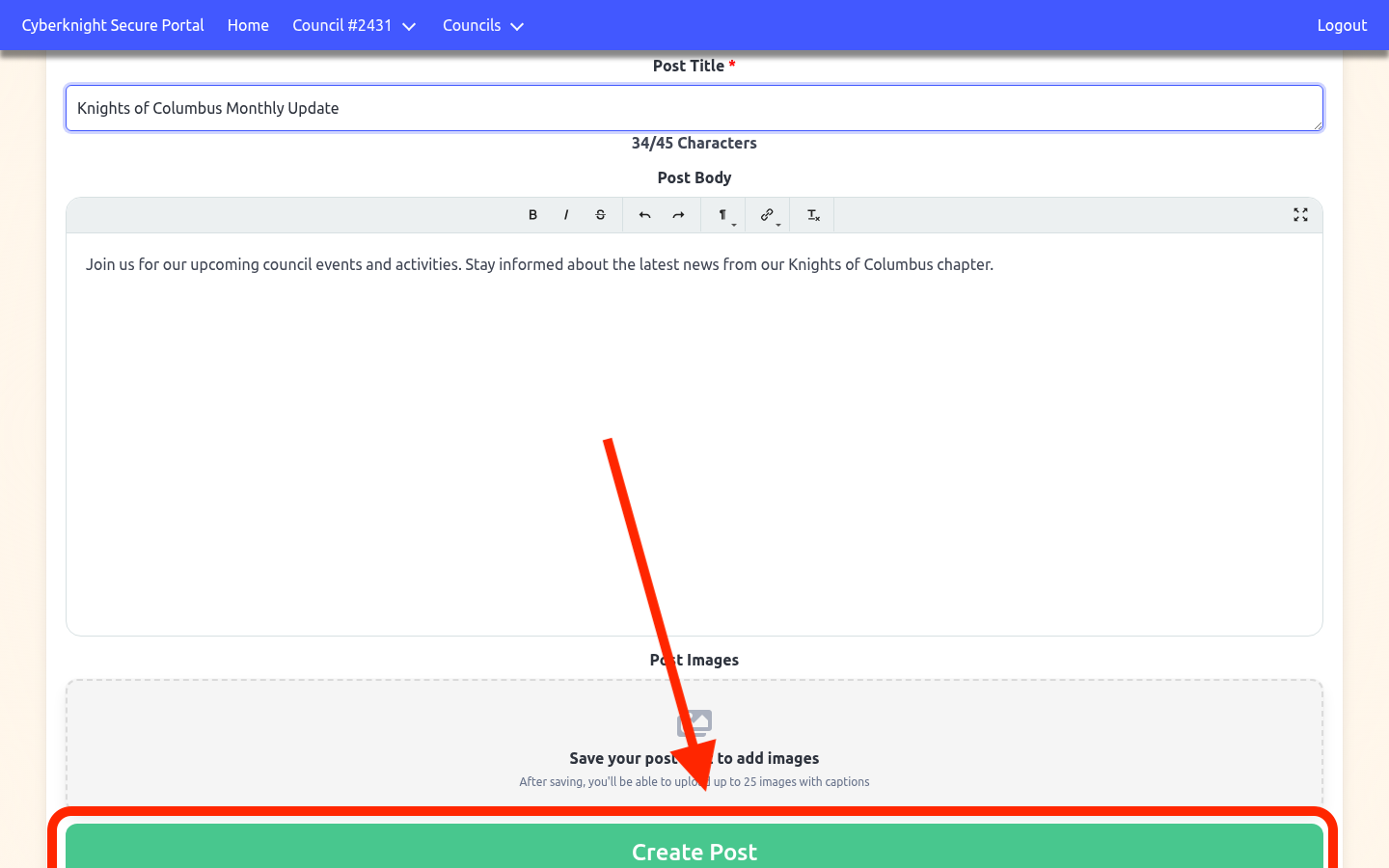 Click Create Post at the bottom of the form. A loading indicator will appear while the post is saved. Once complete, you’ll be taken to the edit page where you can add images.