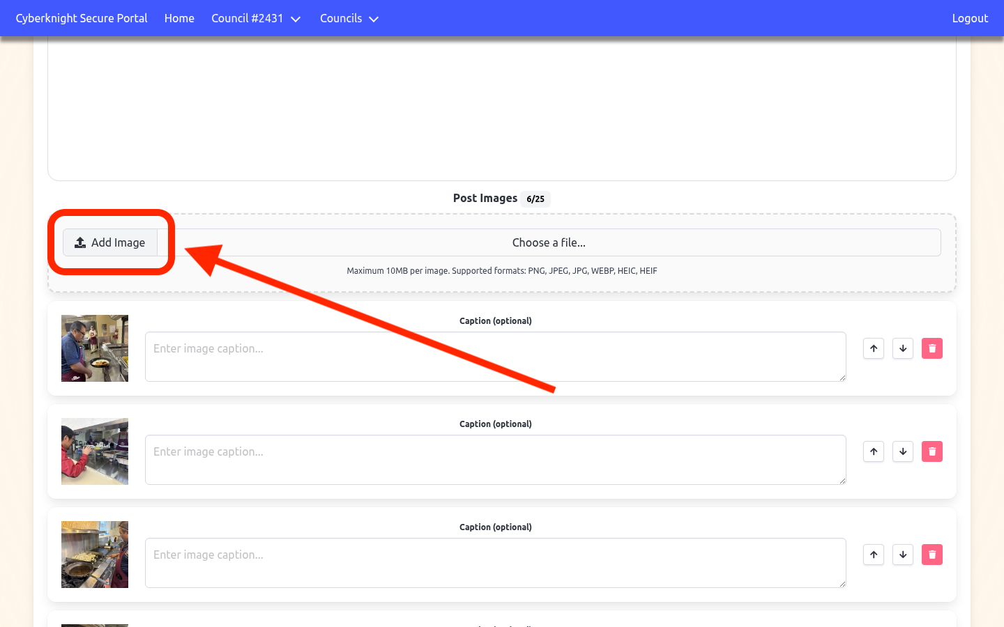 To add an image, click Add Image in the Post Images section and select a file from your device (PNG, JPEG, JPG, WEBP, HEIC, or HEIF — up to 10 MB each). Each image can have an optional caption. Use the arrow buttons to reorder images, or click the trash icon to remove one. Click any thumbnail to preview the full image.