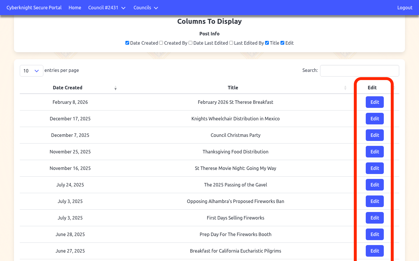 Use the Columns To Display checkboxes above the table to show or hide fields such as Created By, Last Edited, and Last Edited By. Click Edit on any row to open that post for editing.