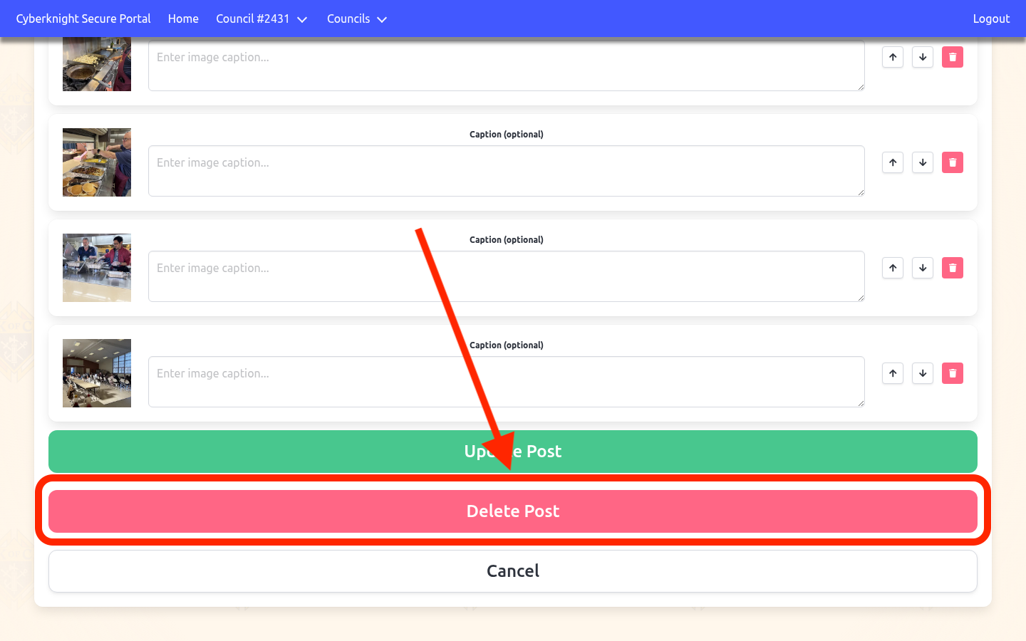 To permanently remove a post, open it in the edit form and click the red Delete Post button at the bottom of the page. This action cannot be undone.